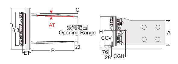 | Capacity 承載能力(kg) | Catalog Order NO 型號(hào) | Mounting Class 安裝等級(jí) | Opening Range張臂范圍(mm) | Arm Height臂高A(mm) | Arm Length臂長(zhǎng)B(mm) | Arm Thickness臂厚C(mm) | Overall Height總高H(mm) | Frame Width 框架寬度D(mm) | Arm Toe in內(nèi)扣量AT(見(jiàn)注5)(mm) | Weight 自重(kg) | Effective 失載距ET(mm) | Horizontal Center of Gravity 水平重心CGH(mm) |